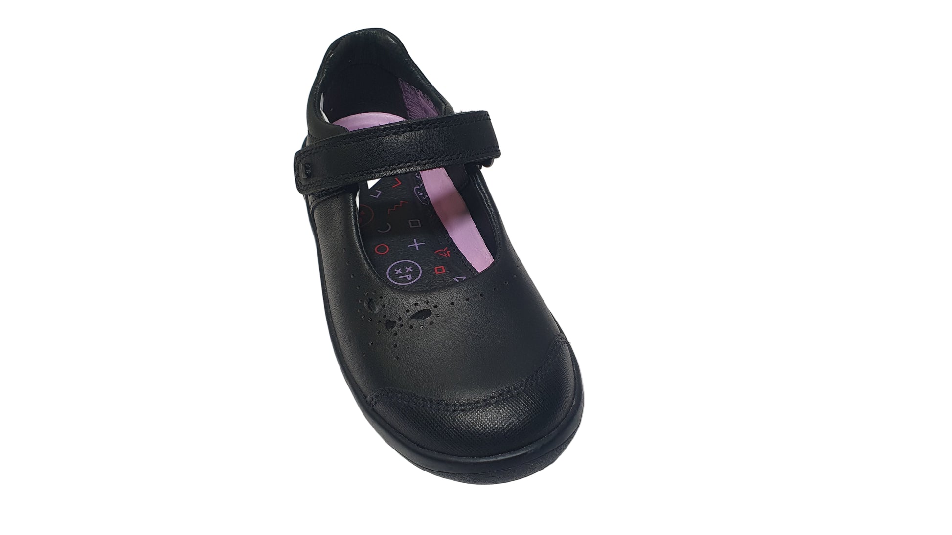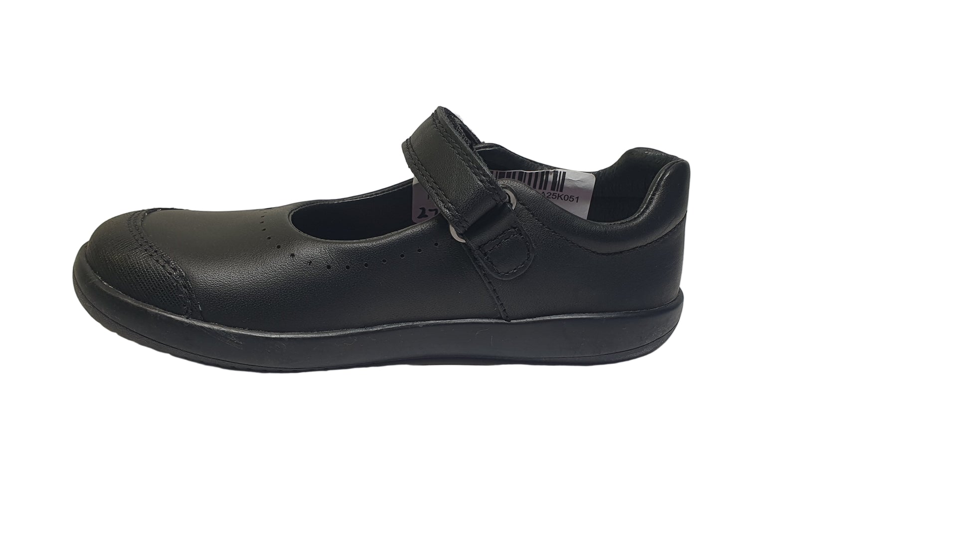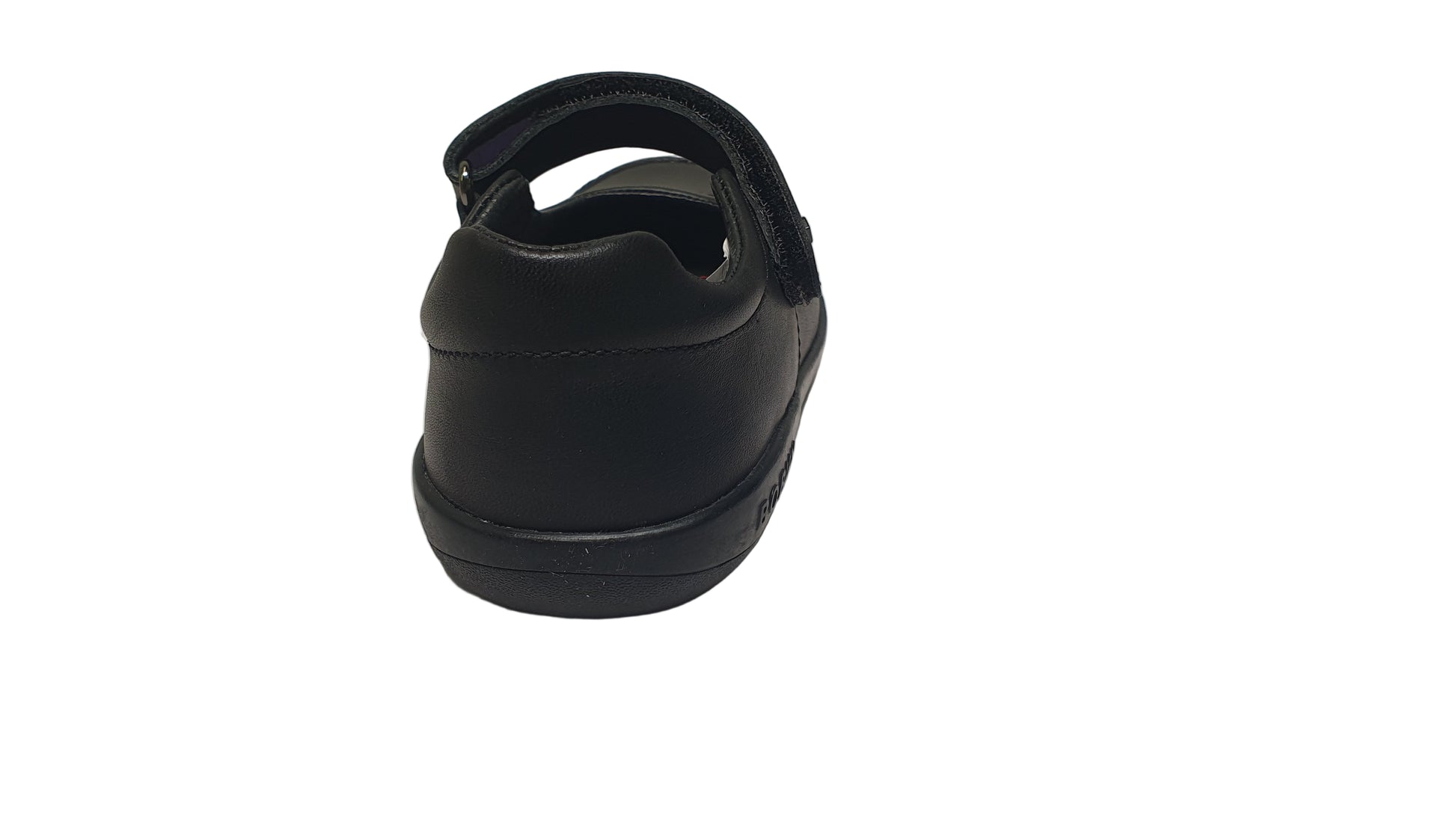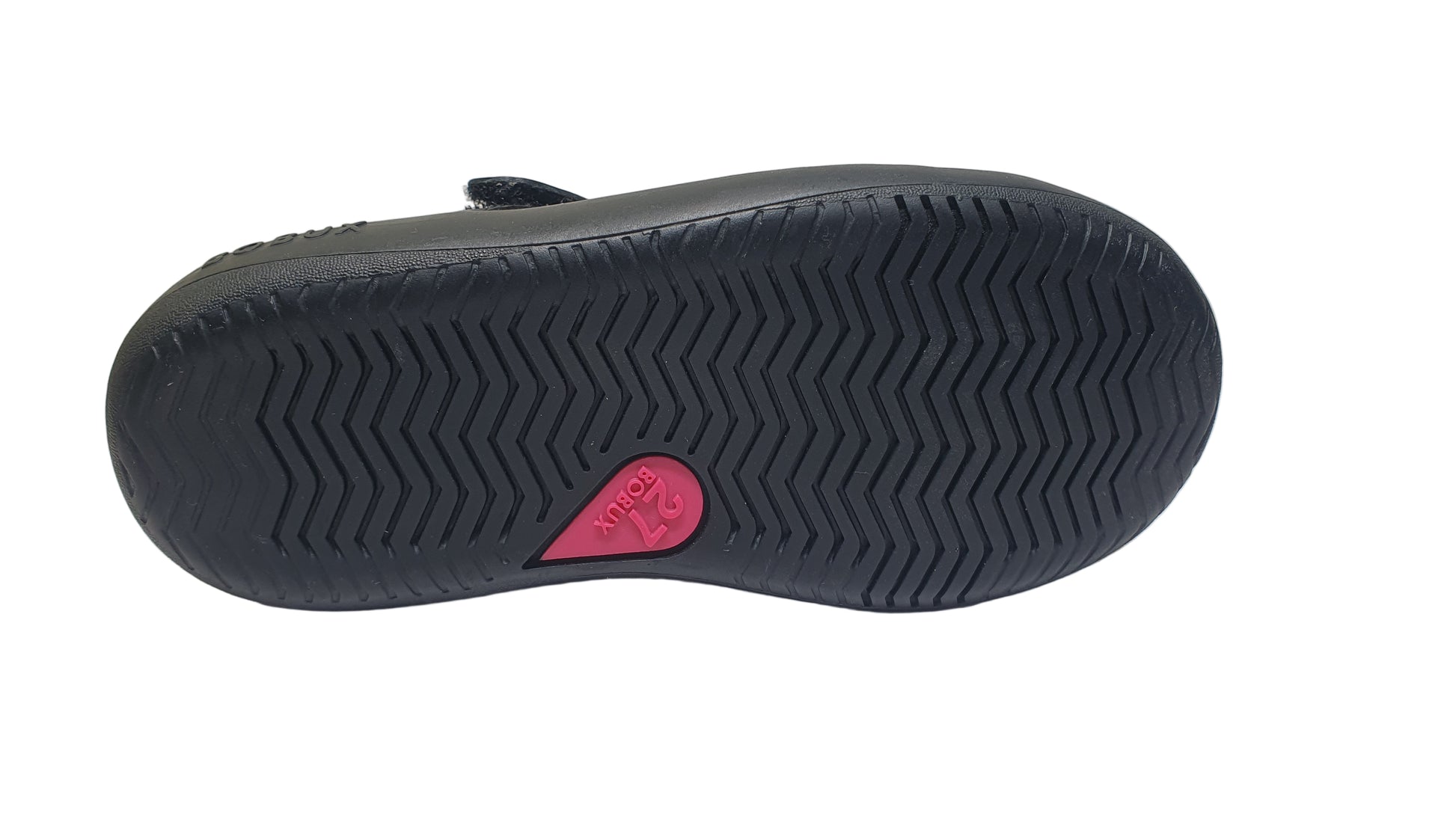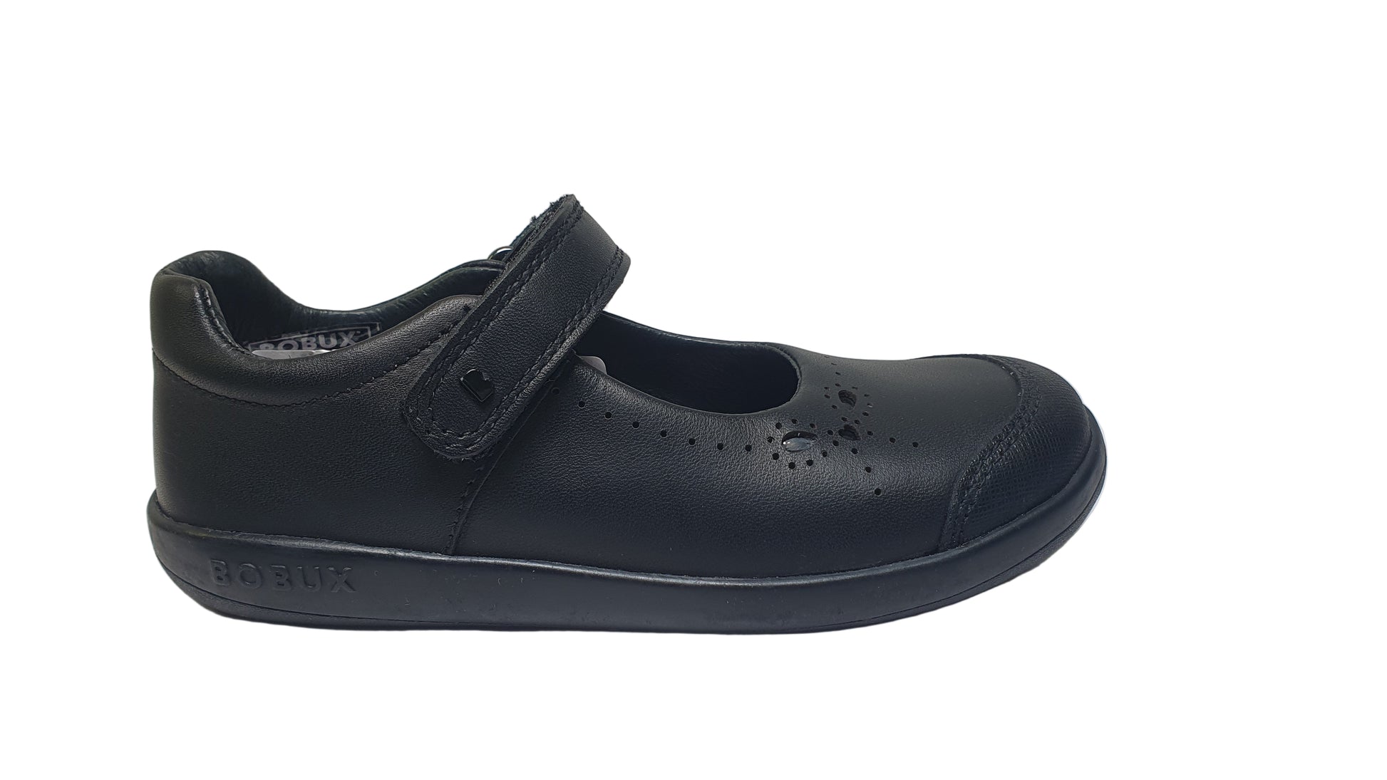KP Rebound Black Leather by Bobux. Mary jane adjustable strap. Cute bow cutout detail.