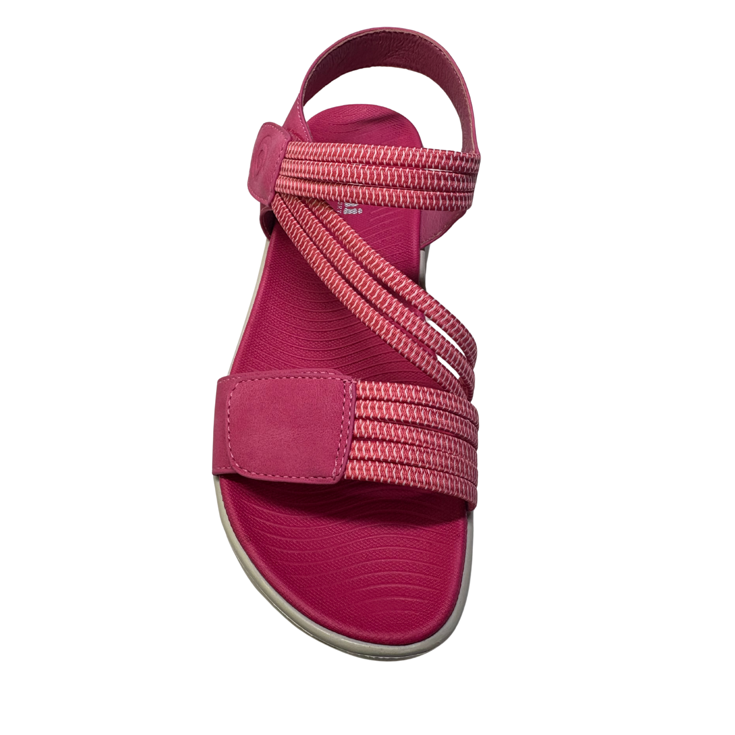 Sporty and supportive, the Menova sandal features a cushioned platform sole, elastic straps, and adjustable closures for all-day comfort on the go.