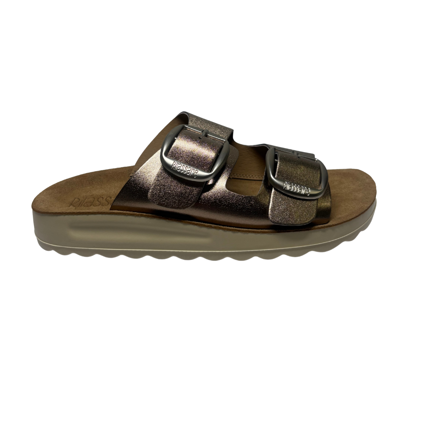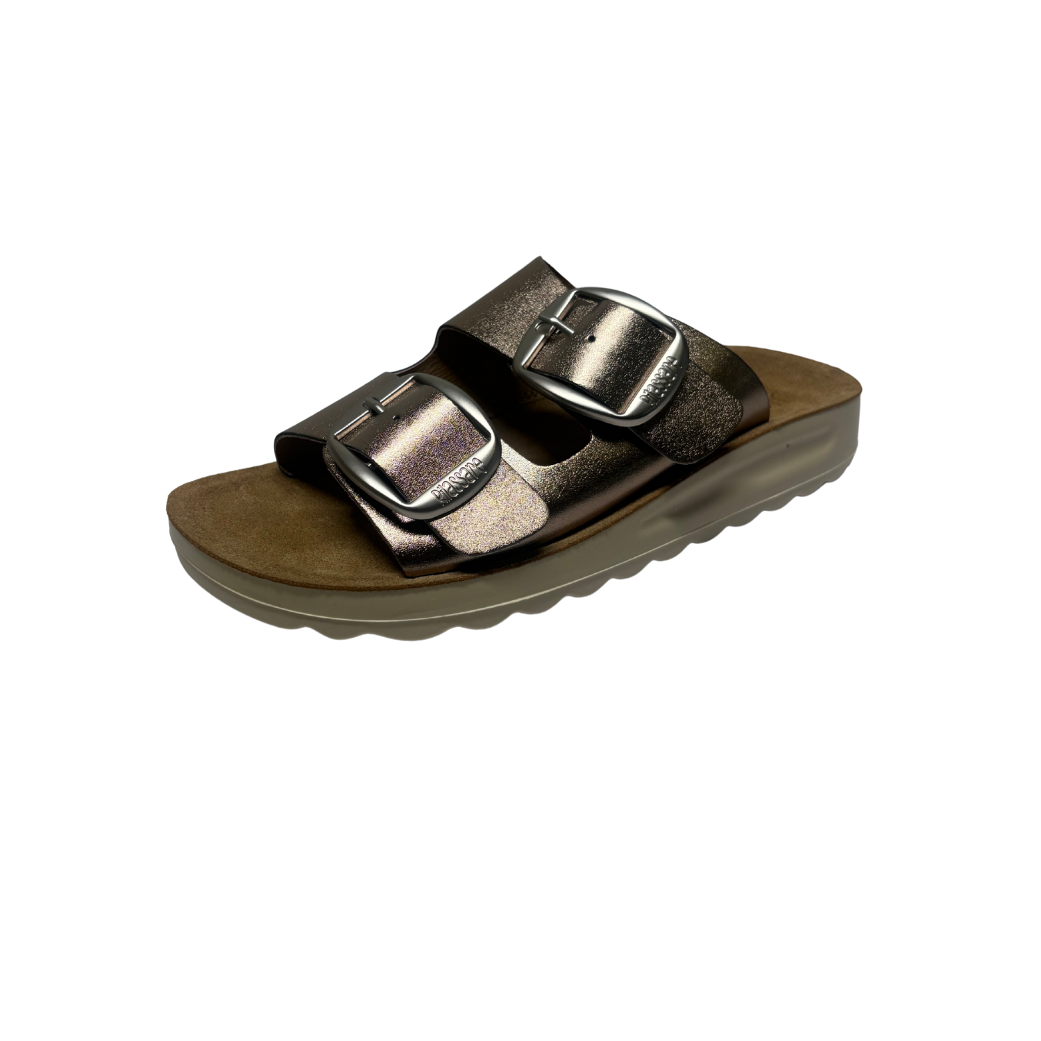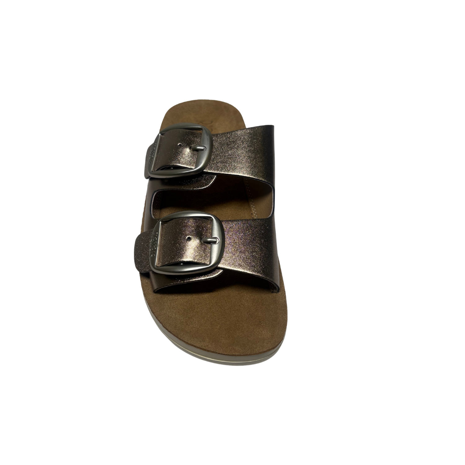 Meet Trippie, the easy, everyday slide with a fresh modern edge. Featuring smooth synthetic straps and statement gold buckles, this style blends simplicity with a touch of glamour. The lightweight cushioned sole keeps you comfortable from morning errands to relaxed weekend wear.