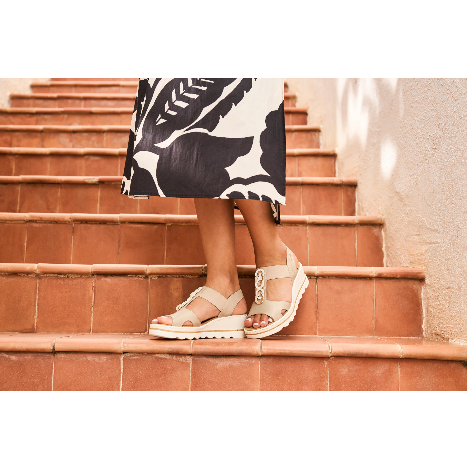Fashionable must-have! These Beige/White wedge sandals by Rieker guarantee a heavenly feeling. In addition, the shoe fits like a glove thanks to the elastic insert. The multi-coloured print is a real eye-catcher. The shock-absorbing and very light sole with wedge heel ensures a pleasant wearing sensation. Your best buddies for the new season!